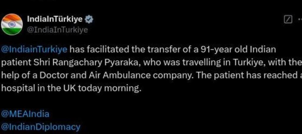 @IndiaInTurkiye has facilitated the transfer of a 91-year-old Indian patient Shri Rangachary Pyaraka, who was travelling in Turkiye, with the help of a Doctor and Air Ambulance company. The patient has reached a hospital in the UK today morning.